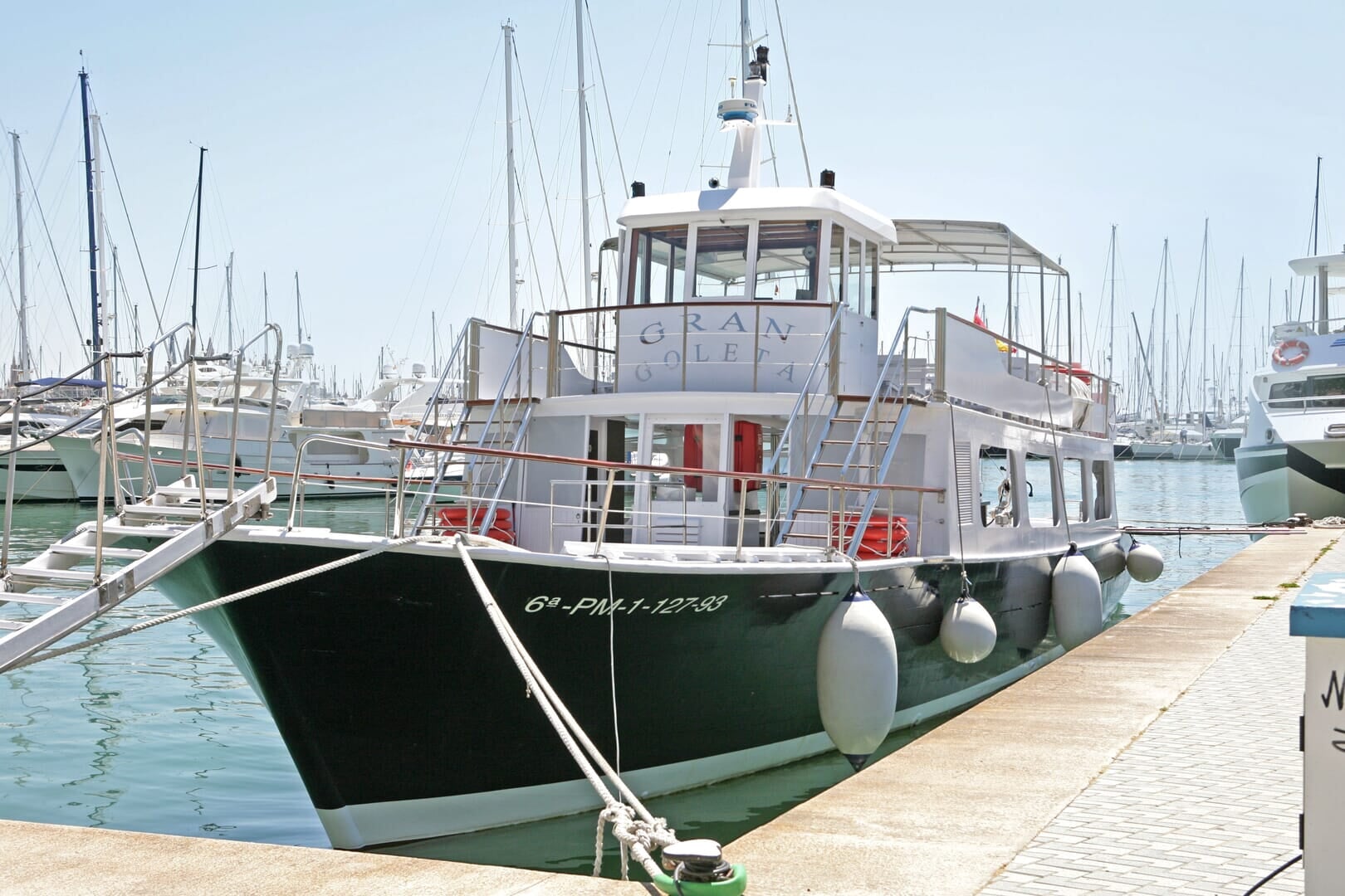 Die Bootstour in Palma dauert ca. eine Stunde und es hat eine Kapazität für 80 Passagiere. Geniessen Sie die wichtigsten Sehenswürdigkeiten von Palma.